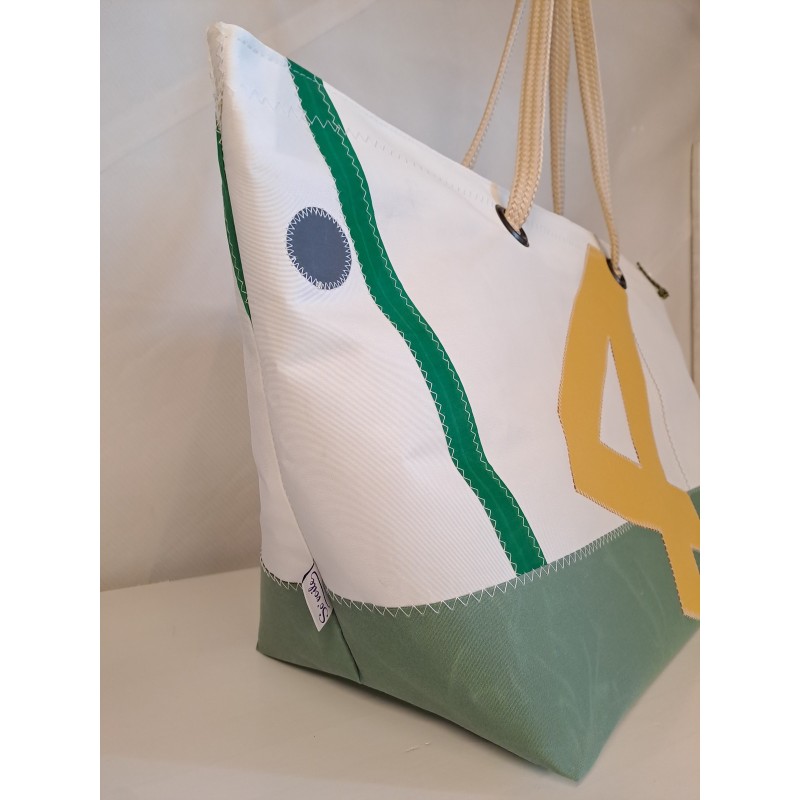 Cabas en voile recyclée, vert olive et chiffre jaune moutarde.