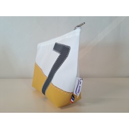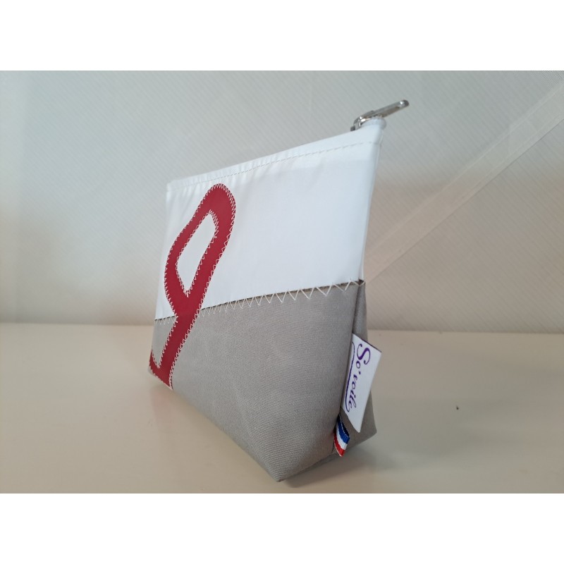Pochette en voile de bateau et toile gris, chiffre rouge.