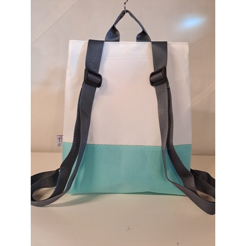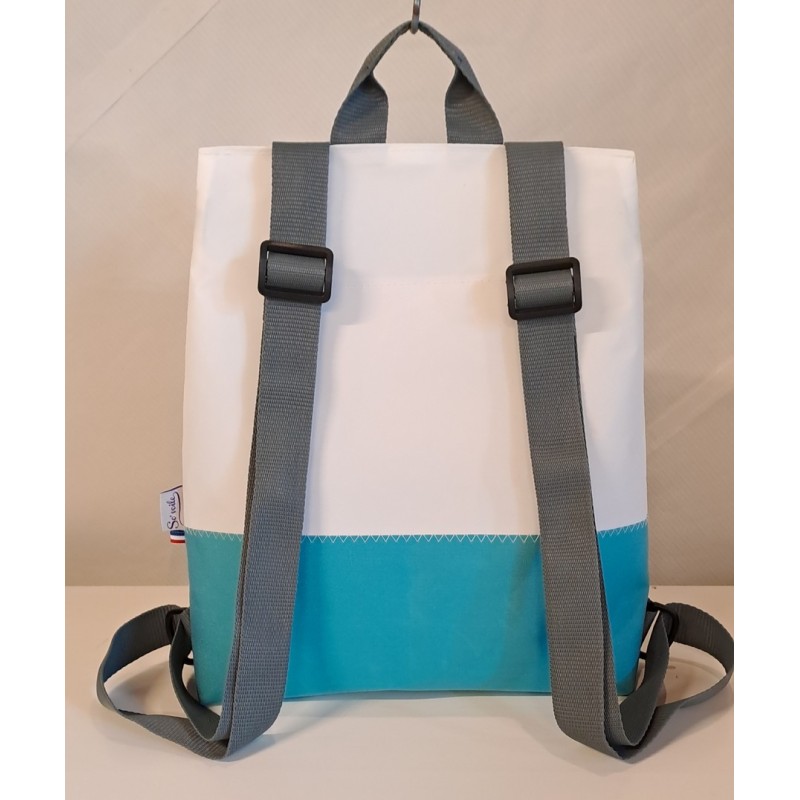 Sac à dos en voile de bateau recyclée et toile acrylique résistante turquoise clair.