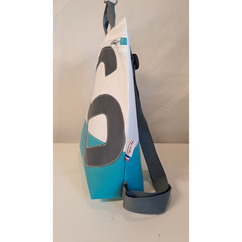 Sac à dos en voile de bateau turquoise clair, chiffre gris.