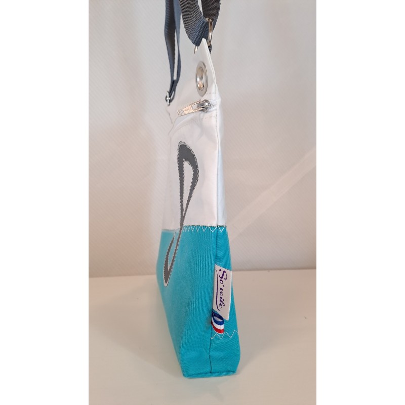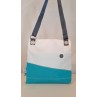 Pochette bandoulière en voile de bateau et toile bleu turquoise.