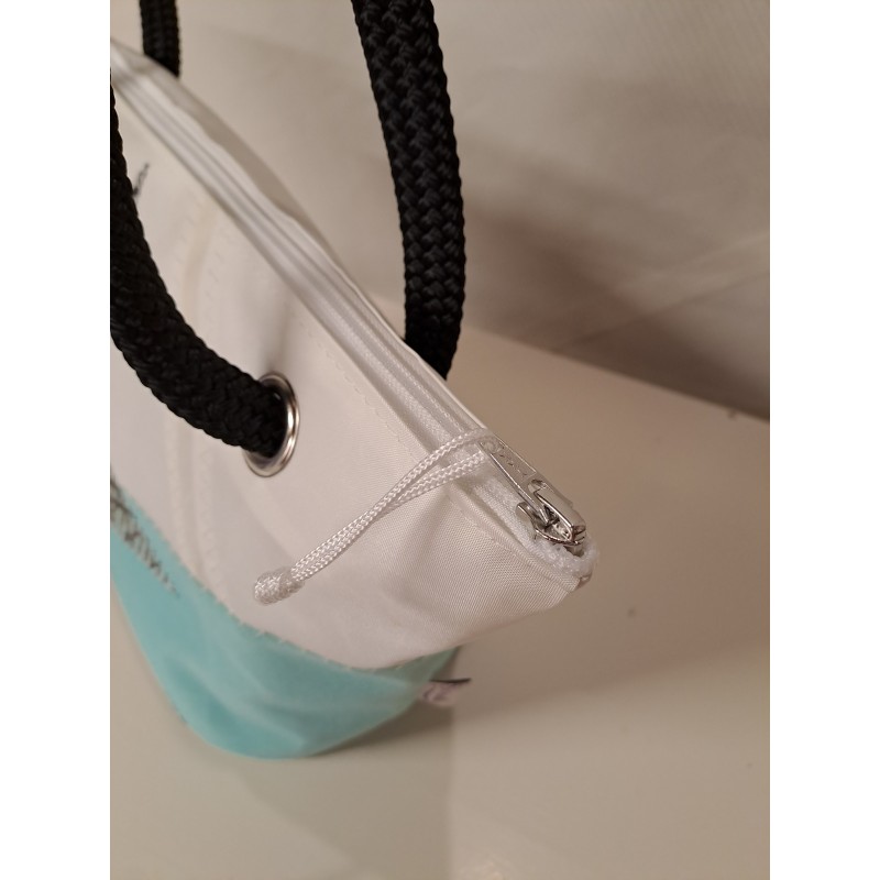 Sac à mains en voile de bateau recyclée et toile acrylique résistante gris et turquoise clair.
