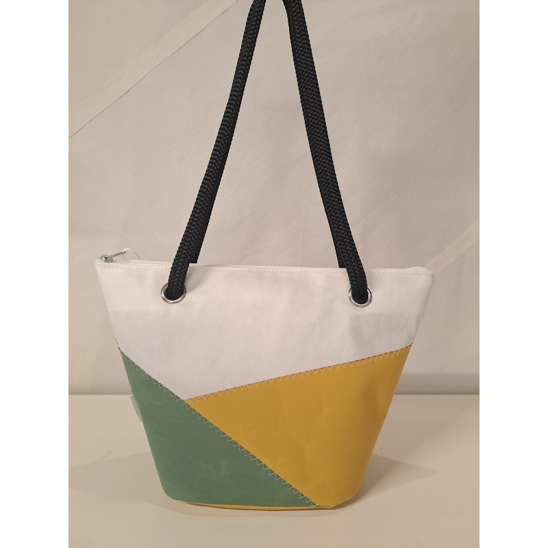 Sac à mains en voile de bateau recyclée et toile acrylique résistante jaune moutarde et vert olive.